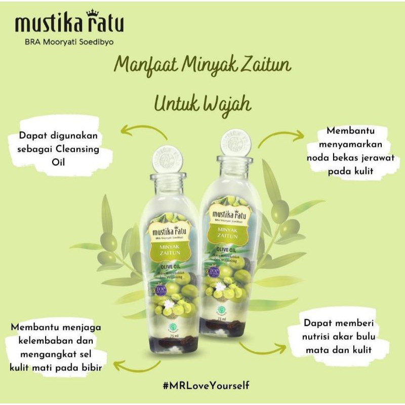 Pt mustika ratu tbk mempunyai produk minyak zaitun yang mengandung antioksidan seperti polifenol yang menolong kulit wajah terbebas dari infeksi . Walaupun belum diketahui apakah minyak zaitun dapat digunakan sebagai obat jerawat alami, bahan ini cukup bermanfaat untuk mengangkat bekas riasan di wajah. Minyak zaitun bisa dijadikan sebagai minyak pembersih wajah alami (cleansing oil) untuk mengangkat . Minyak zaitun ini memang sudah lama guys dipercaya dapat membuat kulit kita menjadi lembut dan bebas dari noda noda hitam , dan banyak juga . Kemudain aduk kedua bahan tersebut hinga .